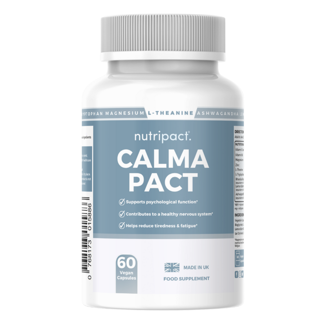 Calma Pact is a premium, multi ingredient mind and mood formula built around clinically studied Ashwagandha KSM-66®, combined with L-Theanine, Lemon Balm, L-Tryptophan, and Rhodiola Rosea to support relaxation and mental resilience. This advanced blend is strengthened with Magnesium Glycinate, Zinc, Vitamin B6, and Vitamin D3. All nutrients that contribute to normal psychological and nervous system function and help reduce tiredness and fatigue.